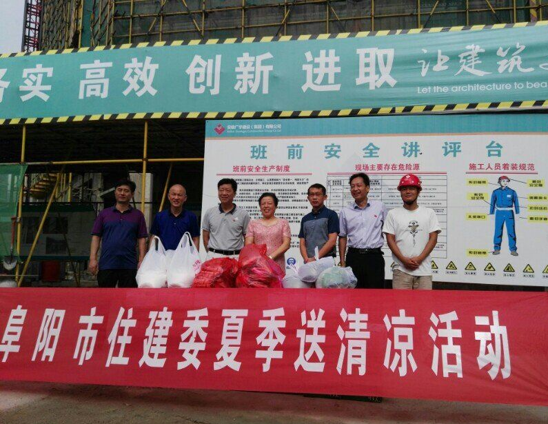 8月10日上午,市住建委機關黨委書記丁麗群、市建管局局長馬西榮、市質監(jiān)局局長楊亞軍、市建管局副局長鈕扣、市建管局安全辦主任丁義龍、市建管局開發(fā)區(qū)分局局長李猛等同志帶領慰問組來到我司商廈國際項目的施工現(xiàn)場,集團公司董事長張濤、副總經理張亞偉同志陪同,將防暑降溫用品發(fā)放到一線工人手中,對施工人員高溫下的辛勤工作表示感謝和慰問,并詳細詢問了工程進展及各項安全措施落實情況,要求施工負責人一定要做好現(xiàn)場勞動保護和防暑降溫工作,合理安排施工時間,切實保障施工人員的身心健康。同時叮囑施工人員在炎熱天氣下工作,要注意自我調節(jié),保重身體,防止高溫中暑。